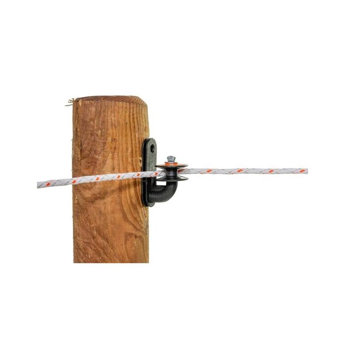 Kunststofisolator voor houten hoekpalen. Geschikt voor cord of kunststofdraad. Eenvoudig te monteren. Draad valt altijd in de rol. Ook geschikt voor montage in een binnenhoek.